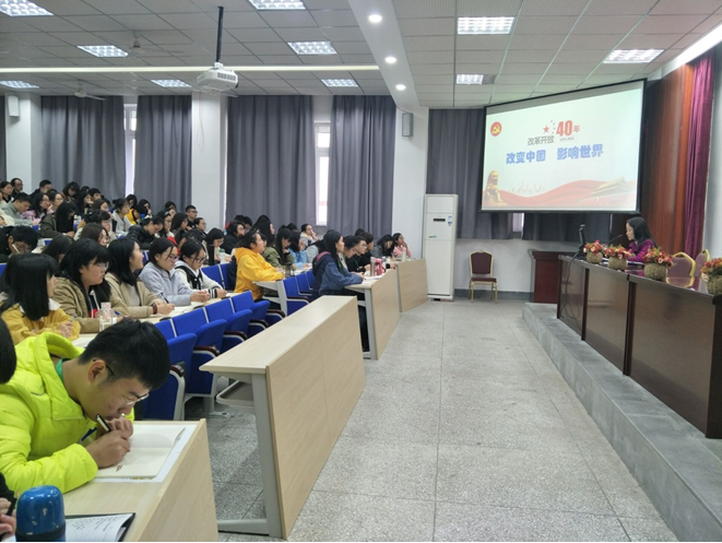 典礼结束后,本期的第一次党课紧接着展开。此次党课由学院党委书记徐天虹主讲,以“改革开放四十年,改变中国,改变世界”为主题,带领学员们深入了解改革开放的历史背景,抽丝剥茧地解读了改革开放的相关措施,并强调了改革开放的必要性与重要性。徐书记提到,从高度集中的计划经济到社会主义市场经济,这四十年,中国发生了翻天覆地的变化,国民收入普遍提高,消费升级步伐加快,人民生活水平从温饱水平到达了整体小康水平,中国更是从封闭型经济弱国走到开放型全球经济大国,从世界舞台边缘日益走近世界舞台中央。我国已经形成了全方位、多层次、宽领域的对外开放格局,中国正日益走向自己的繁荣昌盛。这次党课让学员们更加直观地感受改革开放的辉煌成就,领略了改革开放思想领域取得的丰硕成果。