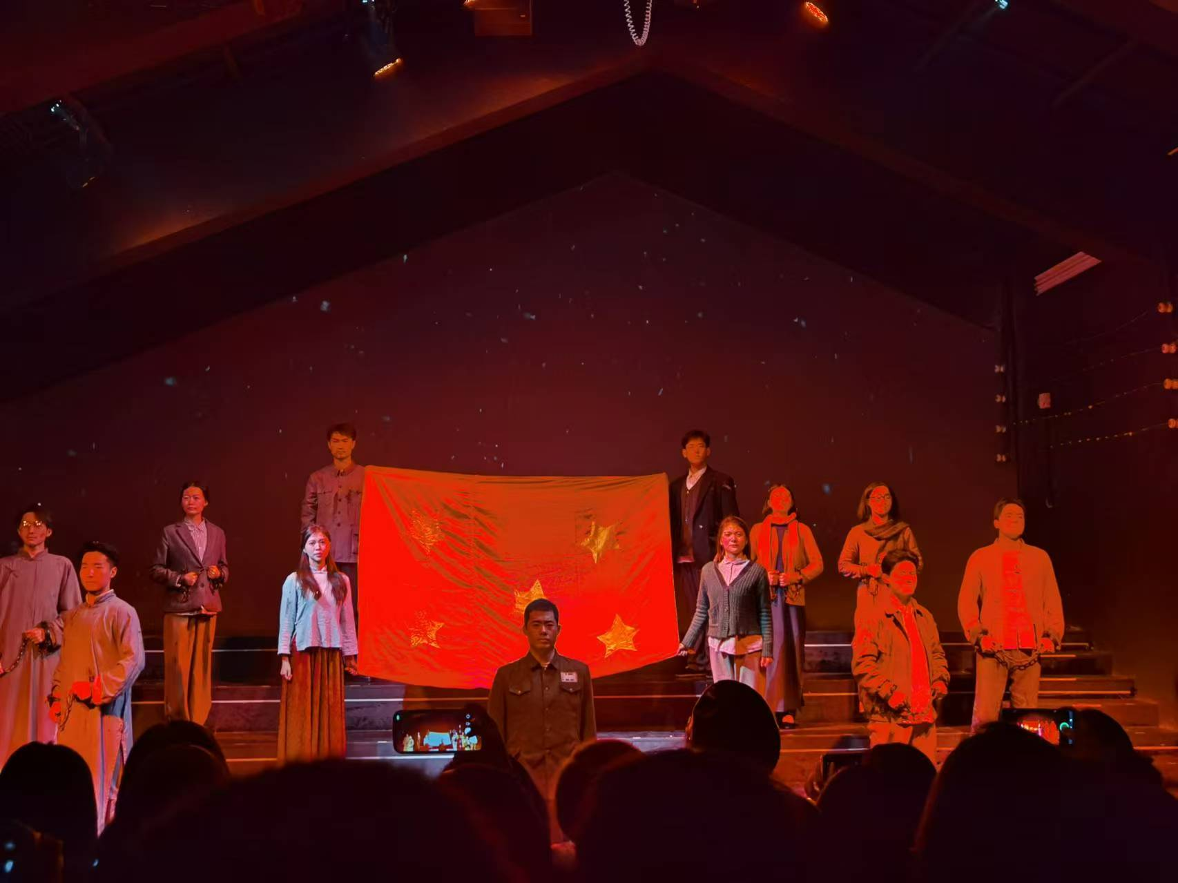 下午1点,全体成员结束渣滓洞的参观后来到红岩红剧场,一起观赏大型情景剧《黎明之前》,演出现场逼真的布景瞬间将观众带回到了那个特殊的年代。演员们以精湛的演技生动地塑造出一个个鲜活的英雄形象。从陈然同志面对敌人酷刑时的坚贞不屈,到王朴同志在狱中大义凛然地与敌人周旋,每一个情节都紧紧抓住了观众的心。而小萝卜头和黄显声将军的那跨越时空的对话,更是叫人潸然泪下。剧中,革命者们在监狱里互相鼓励、坚守信仰的场景,以及他们为了新中国的成立不惜牺牲一切的伟大情怀,都通过演员们的精彩演绎展现得淋漓尽致。同学们沉浸其中,仿佛亲眼目睹了那段血与火交织的岁月。不少人都湿了眼眶。