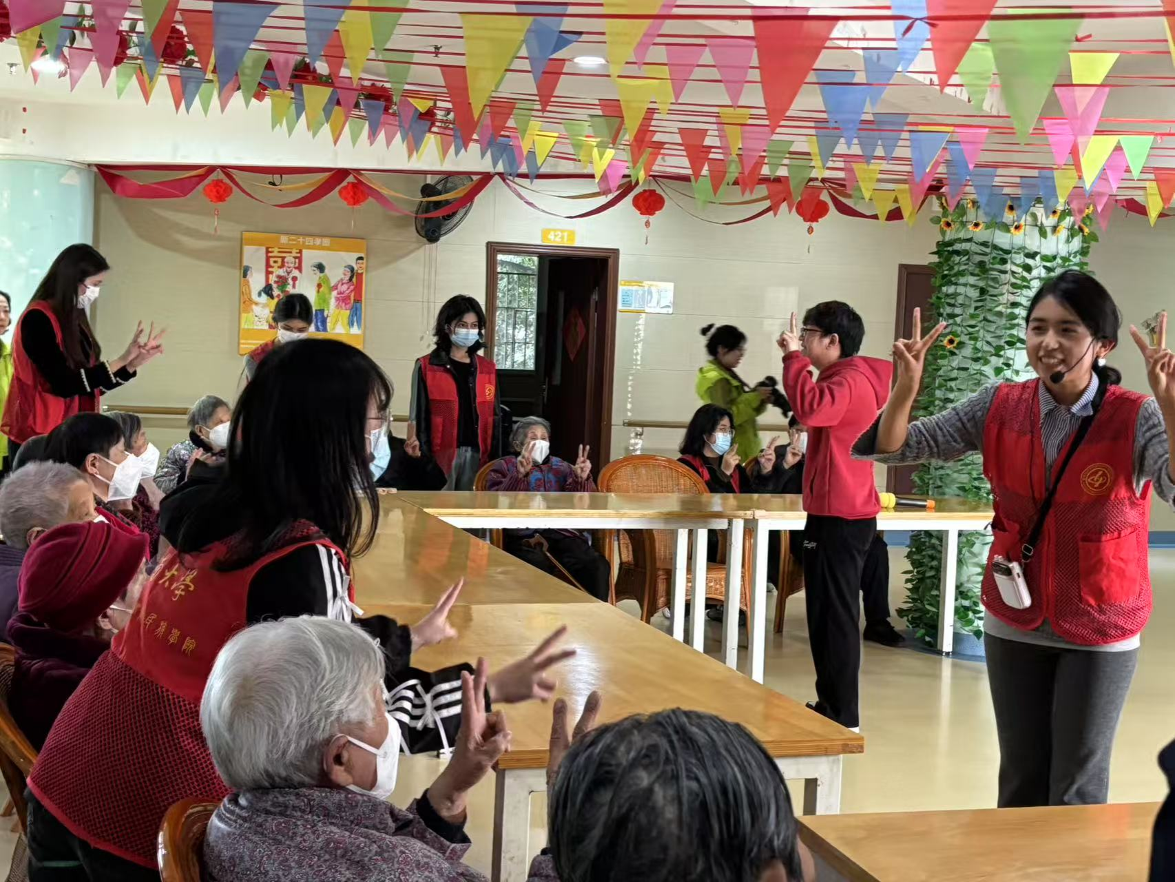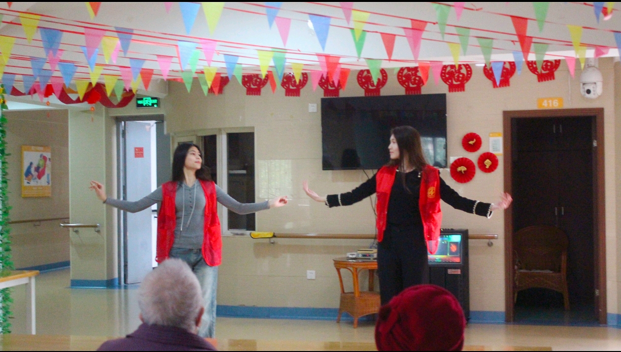 活动伊始,来自新疆的同学以一支热情洋溢的新疆舞蹈拉开序幕。欢快的节奏和灵动的舞姿赢得掌声阵阵,随后一曲悠扬的歌曲《红豆》更让现场充满温情。表演结束后,团支部成员带领老人们做起简单有趣的手指操,通过“指尖律动”帮助老人活动筋骨,现场笑声不断。
