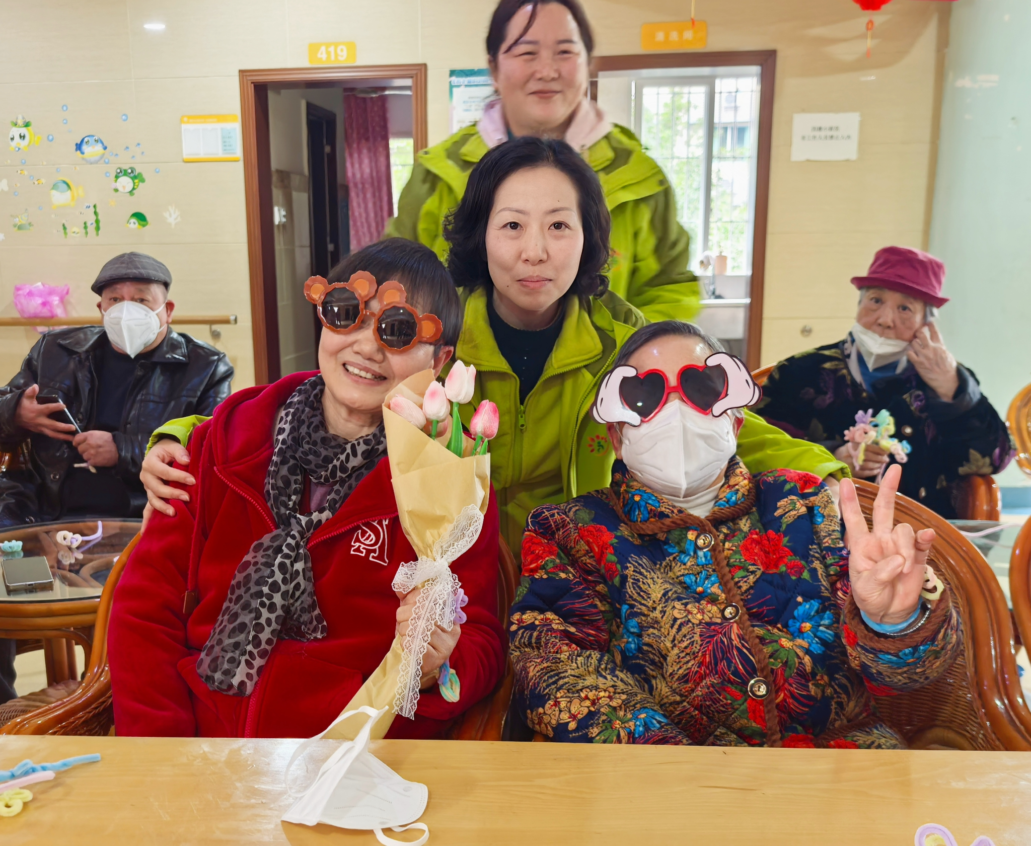活动尾声,同学们陪伴老人用彩色扭扭棒制作花朵、小动物等手工作品,五彩缤纷的创意作品让老人们爱不释手。最后,在“时光照相馆”环节,老人们戴上墨镜、手持花朵、风车等趣味道具,同学们化身摄影师为每位老人拍摄专属纪念照,镜头下的灿烂笑容为活动画上温馨句号。