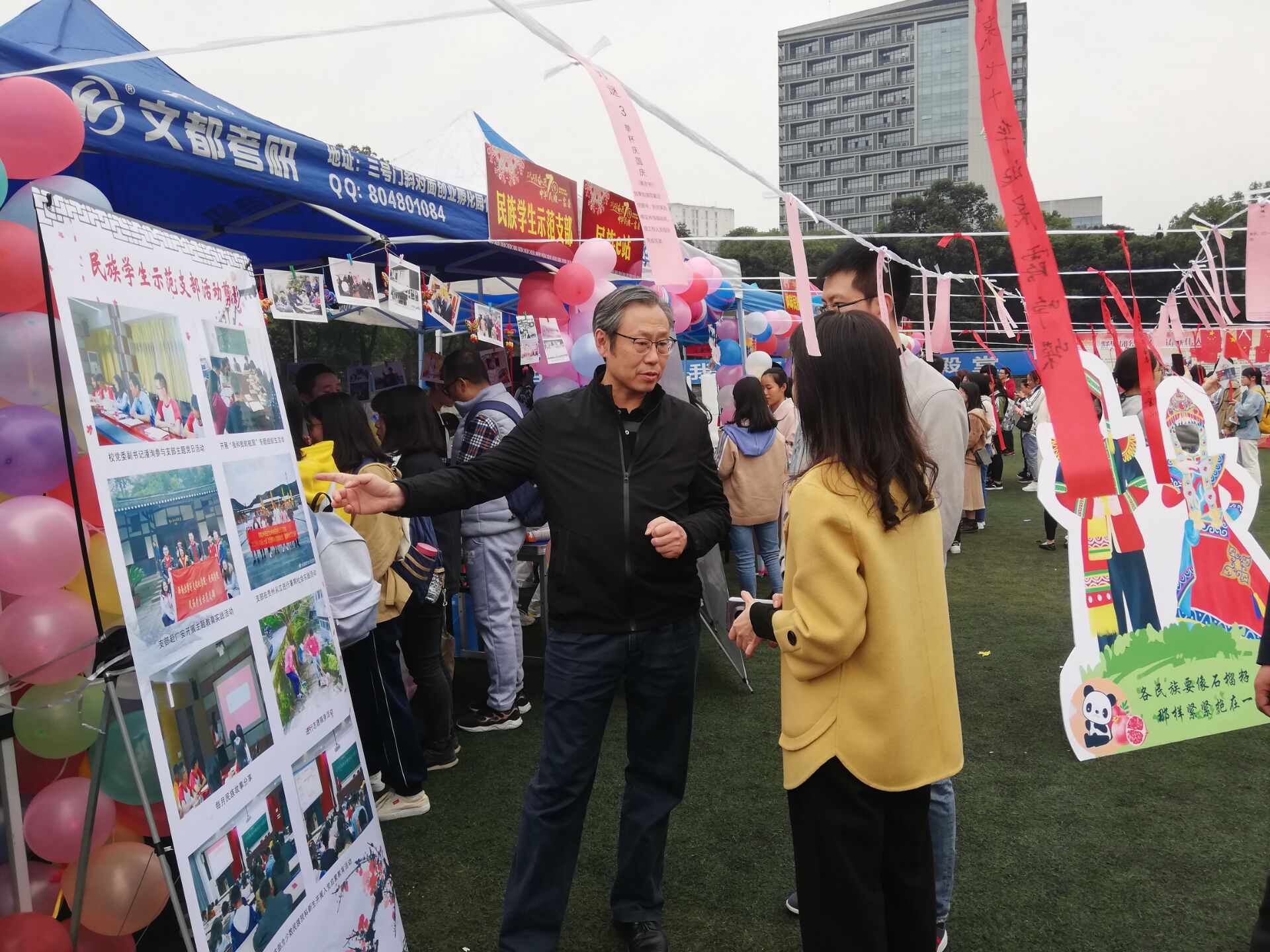 11月15日下午两点半,民族文化游园会准时在第三运动场举行,维吾尔族姑娘带来的开场舞《心上人》撩人心弦,迅速点燃了到场师生们的活力与热情。游园会开始后不久,安春元副书记来到游园会现场,仔细参观各个少数民族展台,了解不同民族文化与风俗,并与少数民族同学们进行亲切交流。到场的师生们也积极参与各民族的特色活动,品尝民族特色美食,体验民族活动。游园会现场热闹非凡,民族氛围十分浓厚。