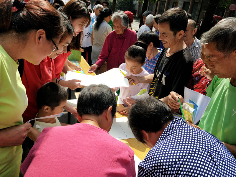 上午九时三十分,志愿者们将提前制作的垃圾分类知识宣传手册分发到居民手中,并为之详细讲解如何分类投放生活垃圾。在现场居民充分了解垃圾分类的标准后,志愿者们开展了“垃圾大转盘”、“乒乓球分类”、“踩气球答题”、“创意涂鸦”四项趣味游戏,帮助居民深刻记忆垃圾分类标准和相关注意事项。志愿者有序组织游戏,居民踊跃参与活动,现场气氛活跃。