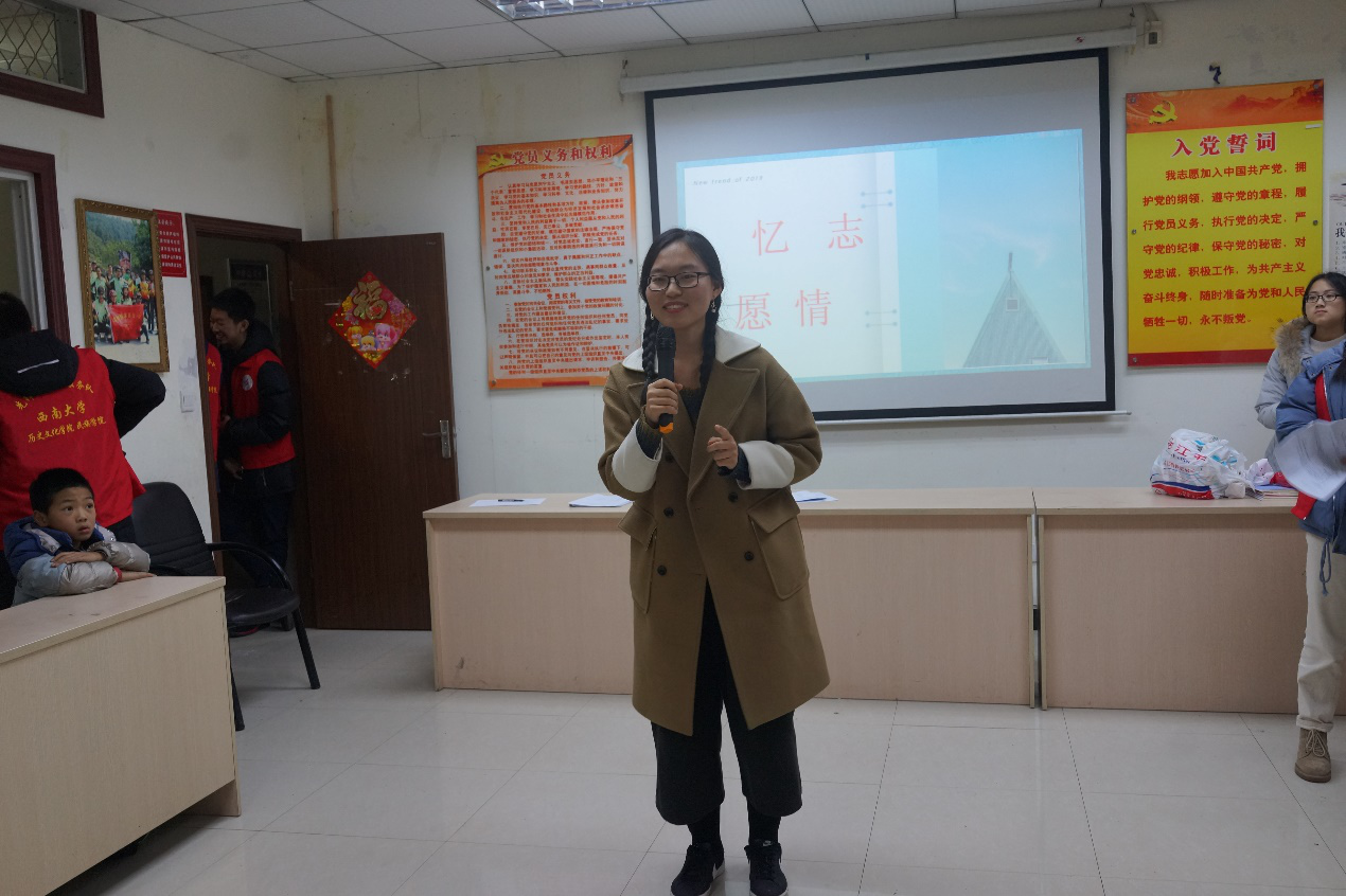 本次活动分为两个部分:作业辅导和元旦主题活动。四点钟小朋友们陆续来到教室,志愿者们为他们进行了简单的作业辅导。四点半在主持人对元旦进行了简单介绍和知识竞答后,元旦主题活动开始。