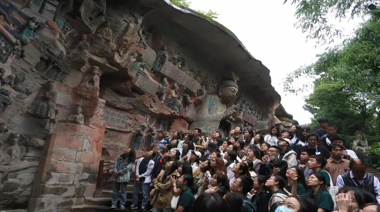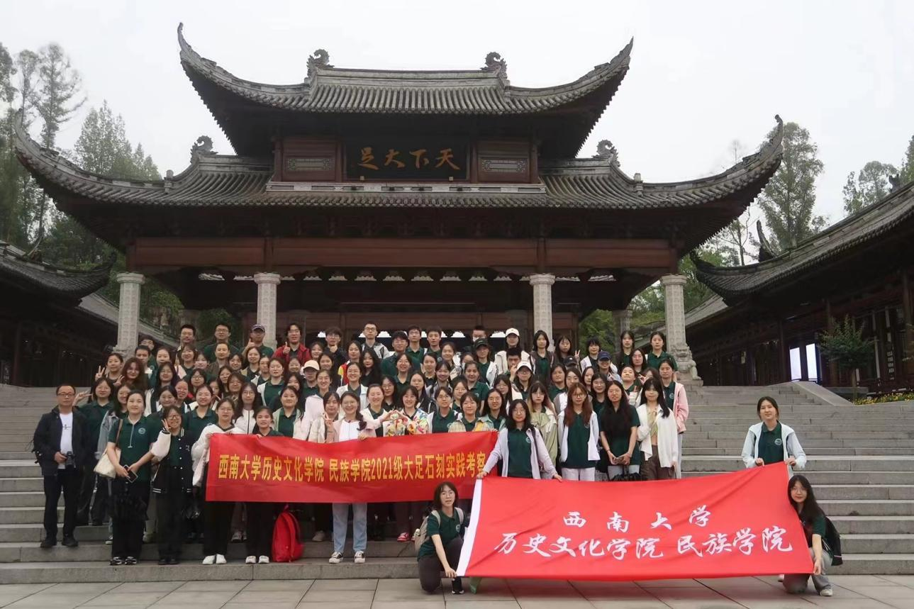 习近平总书记在党的二十大报告中提出,要推进文化自信自强,铸就社会主义文化新辉煌。为响应该号召,同时结合学院专业课《考古学通论》的教学实践环节,2023年6月3日,必赢3003no1线路检测中心必赢3003no1线路检测中心民族学院2021级本科生在任课老师高海燕老师和历史学班班主任杜林泽老师的带领下,前往大足石刻开展课程实践。此次活动共有师生93人参加,主要考察了大足宝顶山石刻、博物馆和北山石刻三处。