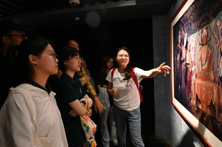大足石刻博物馆艺术感强烈且气势恢宏,馆内分为上三层和下三层,为六层建筑结构,收藏了中国宋、明、清三代石刻文物。入门展厅“一沙一世界”播放着大足石刻最具代表性的雕刻,如千手观音、释迦涅槃圣迹图、水月观音等;第二单元展示了佛教的传承——西佛东渐,介绍佛教如何通过丝绸之路冲破一个又一个封闭的文化圈,融入我国。之后同学们参观了大足石刻一比一复刻的三尊佛像——日月观音、文殊菩萨和普贤菩萨;雕刻大足的文氏工匠家族世系图表;大足石刻观音造像;“艺海拾贝”中一些零散的石刻;宋墓仿雕等。博物馆内的石刻雕像令人目不暇接,同学们带着求知欲与敬畏感沉浸在这浓厚的佛教艺术氛围里,感受跨越时空的历史。