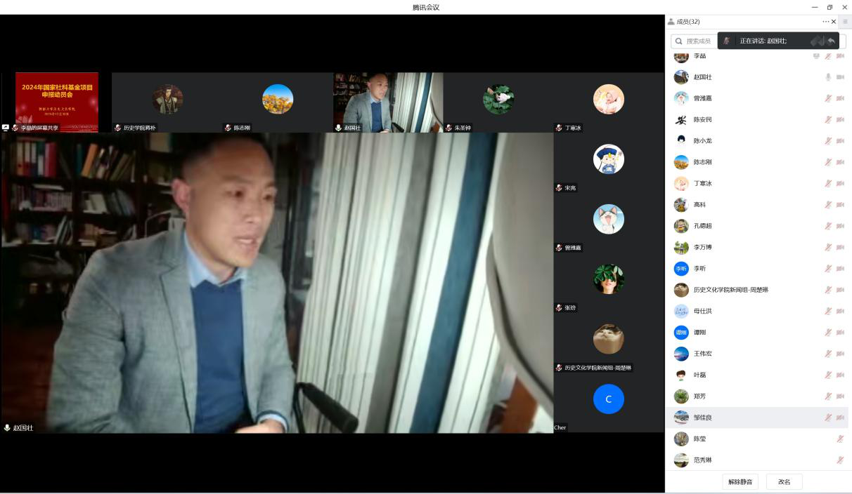 随后,李晶副院长向与会人员介绍了学院2024年国家社科基金项目申报工作的各项安排,并强调各申报人需提前谋划选题和申报书撰写为线上申报预留充裕时间;申报人需提高政治站位,注意选题价值引领,服务国家重大战略;早建团队,精诚合作、联合攻关;积极配合学院申报专项活动全面展开。最后,学院教师陈安民、曾潍嘉、李昕、孔德超就国家社科基金申报的成功经验进行了分享。