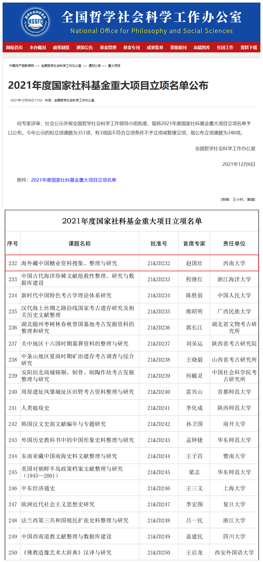近日,全国哲学社会科学规划办公室公布了2021年度国家社科基金重大项目立项名单,学院赵国壮教授作为首席专家领衔申报的“海外藏中国糖业资料搜集、整理与研究”(批准号21&ZD232)获批立项。该项目拟围绕“全球史视域下中国糖业的世界参与(17-20世纪中叶)”论题,计划分区域(荷兰、东南亚、英国、日本)系统地整理海外藏中国糖业资料,以期集成《海外藏中国糖业资料汇编》十二册(约360万字)的丰富史料,夯实中国糖业史研究的资料基础,推动中国糖业史研究整体迈上一个新台阶(《全球史视域下的中国糖业史研究(17-20世纪中叶)》六卷本,约180万字),进而形塑中国糖业史研究品牌,建构中国糖业史研究的话语体系,丰富17-20世纪中叶中国与世界之间关系图景。