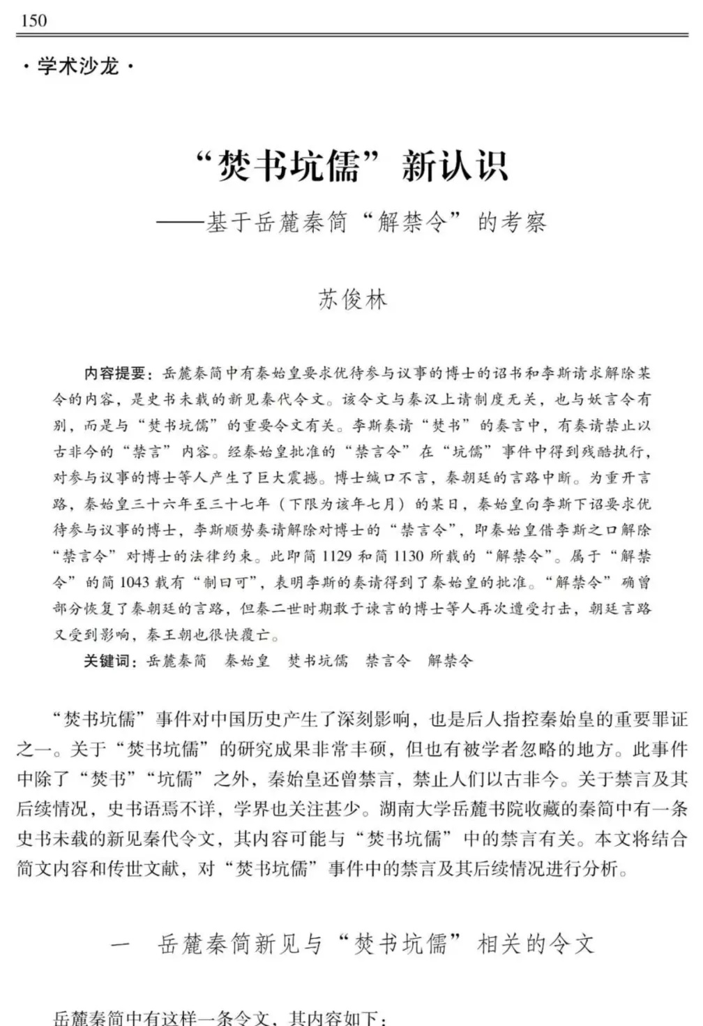 近日,由中国社会科学院主管、中国社会科学院古代史研究所主办的中国古代史领域的专业学术期刊《中国史研究》2025年第2期发表了学院苏俊林教授的学术论文《“焚书坑儒”新认识——基于岳麓秦简“解禁令”的考察》。