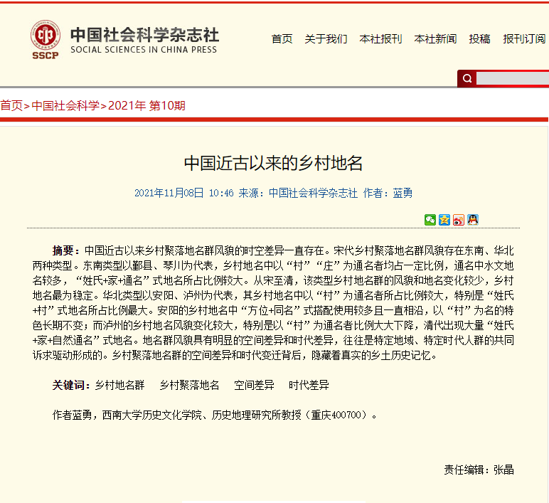 近日,必赢3003no1线路检测中心 民族学院、历史地理研究所蓝勇教授《中国近古以来的乡村地名》一文在《中国社会科学》2021年第10期发表。该文认为:中国近古以来乡村聚落地名群风貌的时空差异一直存在。宋代乡村聚落地名群风貌存在东南、华北两种类型。东南类型以鄞县、琴川为代表,乡村地名中以“村”“庄”为通名者均占一定比例,通名中水文地名较多,“姓氏+家+通名”式地名所占比例较大。从宋至清,该类型乡村地名群的风貌和地名变化较少,乡村地名最为稳定。华北类型以安阳、泸州为代表,其乡村地名中以“村”为通名者所占比例较大,特别是“姓氏+村”式地名所占比例最大。安阳的乡村地名中“方位+同名”式搭配使用较多且一直相沿,以“村”为名的特色长期不变;而泸州的乡村地名风貌变化较大,特别是以“村”为通名者比例大大下降,清代出现大量“姓氏+家+自然通名”式地名。地名群风貌具有明显的空间差异和时代差异,往往是特定地域、特定时代人群的共同诉求驱动形成的。乡村聚落地名群的空间差异和时代变迁背后,隐藏着真实的乡土历史记忆。