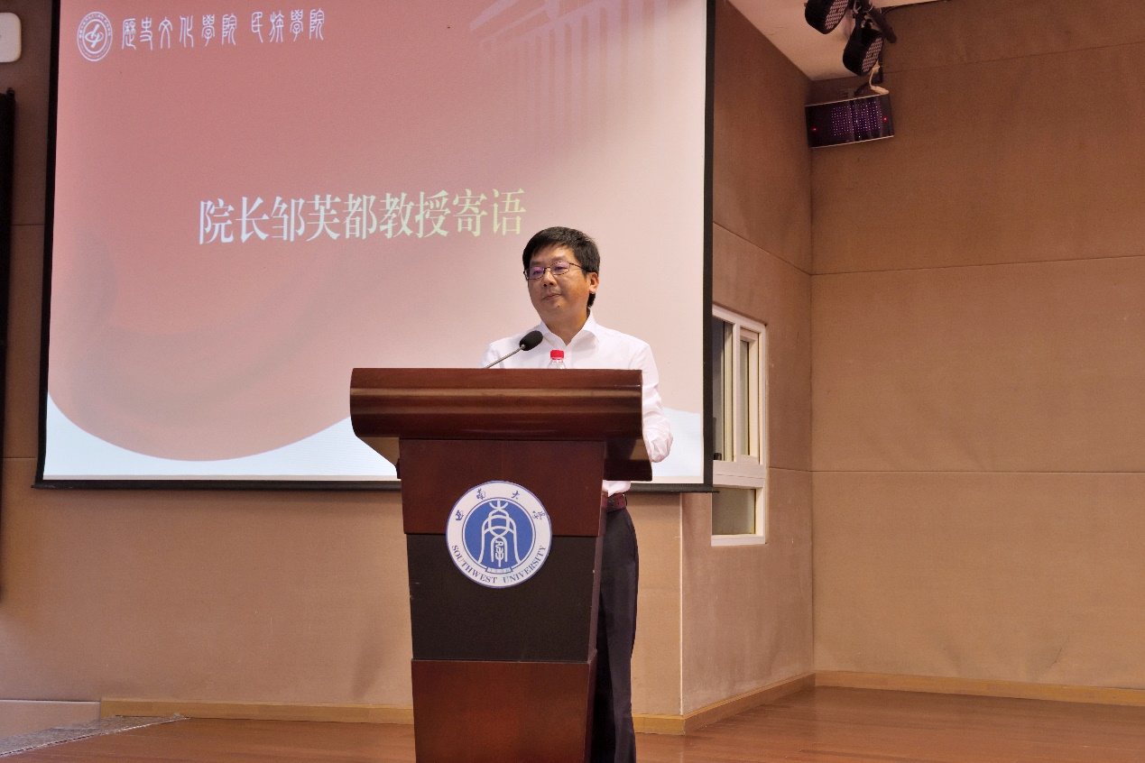 毕业典礼最后,院长邹芙都教授为学院全体2023届毕业生送上临别寄语。他深情回忆了同学们的成长点滴和丰硕成绩,用风趣而深刻的语言,鼓励同学们牢记习总书记对传承发展中华文明的殷切嘱托,做一名顶天立地者,创造属于自己的精彩人生,汇聚实现中华民族伟大复兴的磅礴力量。他祝愿,同学们前程似锦、鹏程万里;他期待,同学们常回家看看!