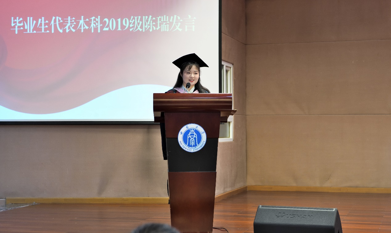 毕业生代表、本科毕业生陈瑞同学向全体师生讲述了她在刘志英教授感召下走入历史学、在专业实习中走入学生内心的一幕幕动人场景,也满怀深情地回忆起同学们在时代的机遇与考验下,一个个奋斗的身影。陈瑞同学号召全体毕业生,“踏平坎坷成大道,斗罢艰险又出发”!