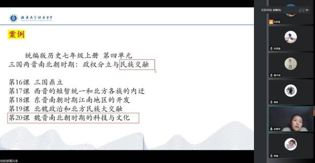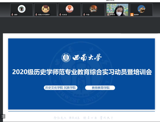 2023年1月4日下午,学院线上召开了2020级历史学(师范)专业教育综合实习动员暨培训大会。学院党委副书记张静、学院副院长李晶、教师教育学院及我院指导教师曹华清、袁从秀、谢欧、范敏、杜林泽以及学院2020级全体师范生参加本次大会。大会由2020级本科生辅导员李蓉若主持。为更好开展本次实习培训,学校教师教育学院特别邀请重庆市兼善中学副校长冉崇娟、必赢3003no1线路检测中心附属中学校教师赵敏岩为我院2020级师范生开展教育实习专项培训。