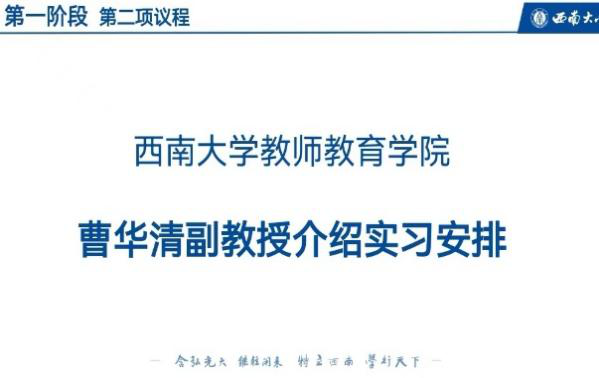 曹华清副教授向同学们介绍了本次实习的各位指导老师,通过介绍梳理教育实习各环节的注意事项,帮助全体同学明确实习过程中的具体要求、考核标准等内容。她还号召同学们积极参与实习学校的教育教学实践活动、树立正确的学习工作态度、始终体现教师的理想和情怀。