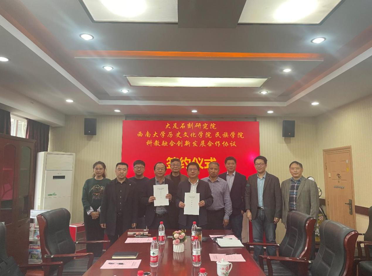 为推动科教融合创新发展,促进我院和大足石刻研究院优势互补、共同进步,2022年10月24日,学院与大足石刻研究院签订科教融合创新发展合作协议。大足石刻研究院副院长刘贤高、大足研究中心主任米德昉、馆员赵凌飞以及学院党政班子成员、教师代表出席本次签约仪式,仪式由李晶副院长主持。