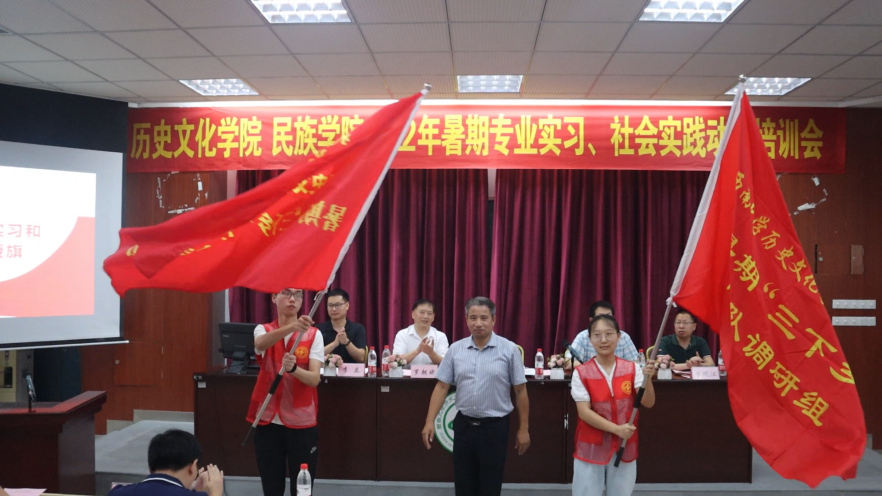 在授旗环节,学院党委书记罗庆昌分别为专业实习和社会实践队伍授旗。