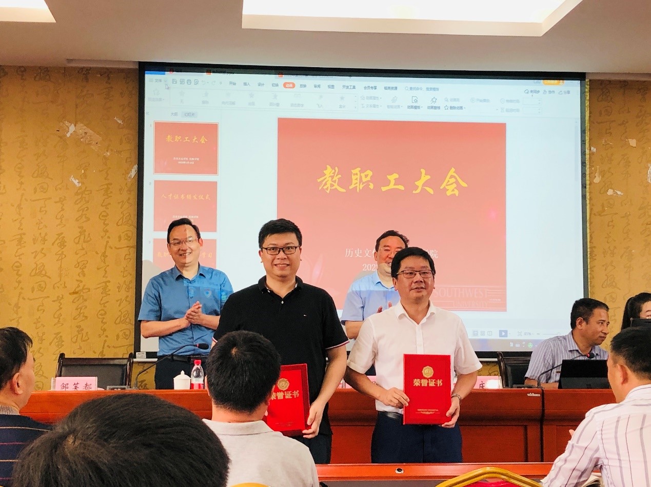 李荣华部长宣读了国家级人才入选通知,并祝贺邹芙都教授入选国家级人才计划哲学社会科学领军人才,陈永亮副教授入选国家级人才计划青年拔尖人才。在代表学校祝贺两位教师后,他期待学院继续坚持引育并举、多管齐下,建设一支有水平、有能力、有情怀的高水平人才队伍,在学科建设、服务国家重大战略等工作中发挥带头作用。