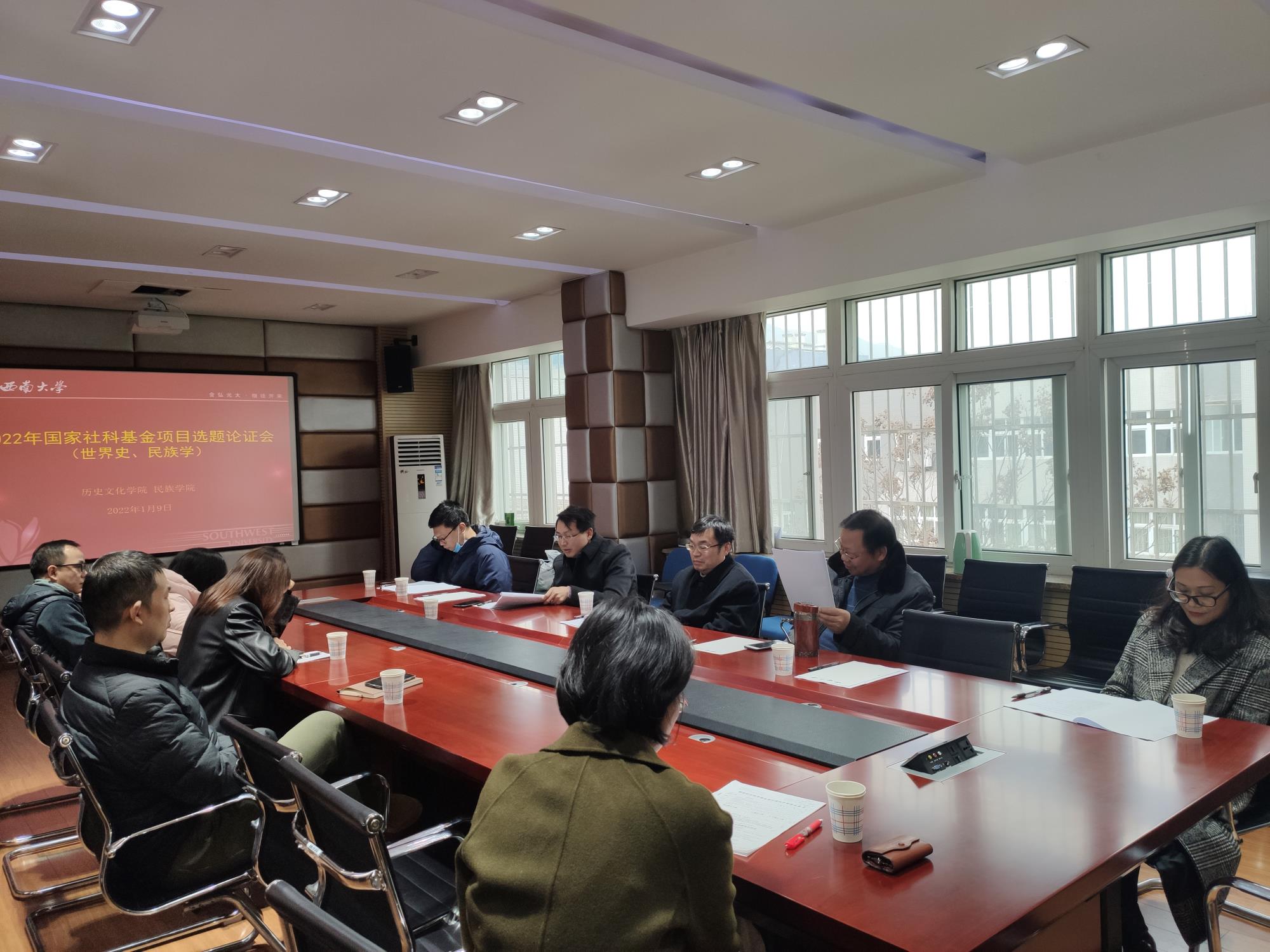 根据学院2022年度国家社科基金申报组织工作的总体安排,为进一步提升项目申报质量,2022年1月9日下午,必赢3003no1线路检测中心 民族学院分中国史、世界史(含民族学)两组召开了2022年国家社科基金项目选题论证会。会议分别由学院邹芙都院长、邓云清教授主持。