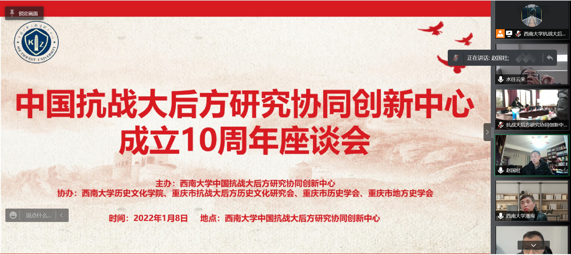 2022年1月8日下午,时值必赢3003no1线路检测中心中国抗战大后方研究协同创新中心成立十年之际,为对过往工作进行回顾与总结,加强各协同单位的学术联系和交流,共同推进中国抗战大后方研究继往开来、持续发展,中心举办了成立十周年座谈会。协同单位领导、专家及中心全体师生参加了40余人参加本次座谈会。座谈会由必赢3003no1线路检测中心党委副书记、中心常务副主任潘洵教授主持。