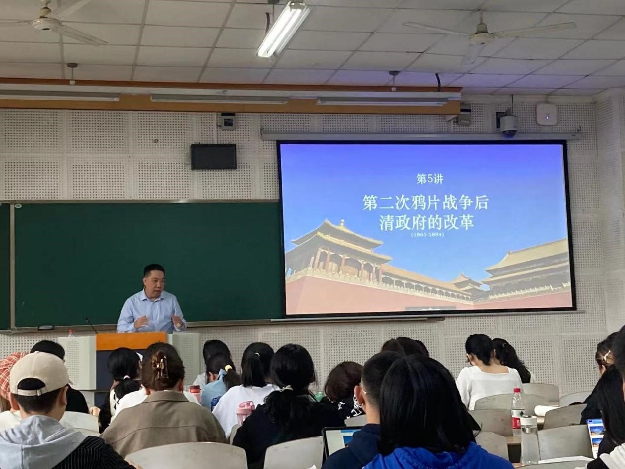 王刚老师的授课内容是“第二次鸦片战争后清政府的改革”。本课主要围绕晚清政府改革的条件、内容、阻力、效果及其反思等要点进行了讲授。授课过程中,王刚老师还运用经典理论,结合毛泽东同志的《中国社会各阶级的分析》一文,深入浅出地帮助同学们区分、理解相关概念。王刚老师借助丰富的史料,带领同学们深刻的认识处于“三千年未有之大变局”的近代中国所遭遇的动荡飘摇。整堂课生动有趣、气氛活跃。