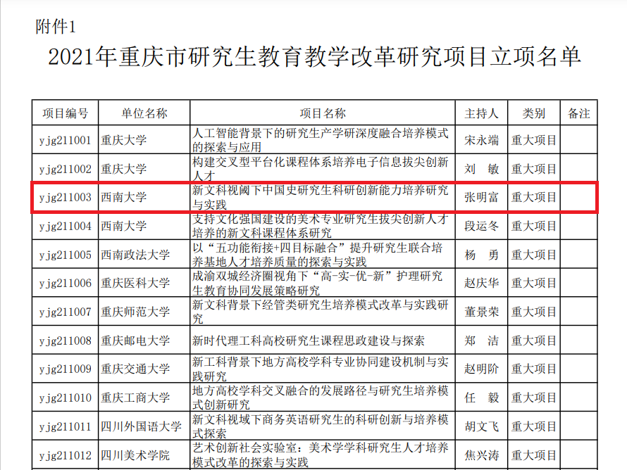 近日,重庆市教育委员会下发了《关于同意2021年研究生教育教学改革研究项目立项的通知》,学院张明富教授主持申报的重大项目《新文科视阈下中国史研究生科研创新能力培养研究与实践》成功获得立项。本次立项工作,重庆市各高校共有26项重大项目获得立项(其中定向、委托项目9项),必赢3003no1线路检测中心共获重大项目6项(其中定向、委托项目4项)。