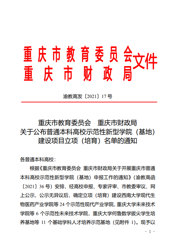 为大力推进现代产业学院、未来技术学院和基础学科人才培养示范基地建设工作,充分发挥各学院(基地)在人才培养中的示范引领作用,有力支撑重庆建成具有全国影响力的科技创新中心,市教委、财政局开展了此次重庆市普通本科高校示范性新型学院(基地)建设工作,建设包括示范性现代产业学院、示范性未来技术学院以及市级基础学科人才培养示范基地在内的三类示范性新型学院(基地),建设周期均为三年左右,全市高校共有41个学院(基地)获得立项。