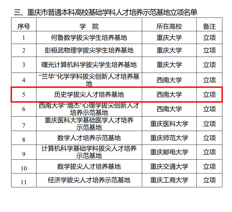 近日重庆市教育委员会、重庆市财政局公布了重庆市普通本科高校示范性新型学院(基地)的入选名单。学院“历史学拔尖人才培养基地”作为基础学科人才培养示范基地成功立项,是必赢3003no1线路检测中心本次入选的3个基地之一。