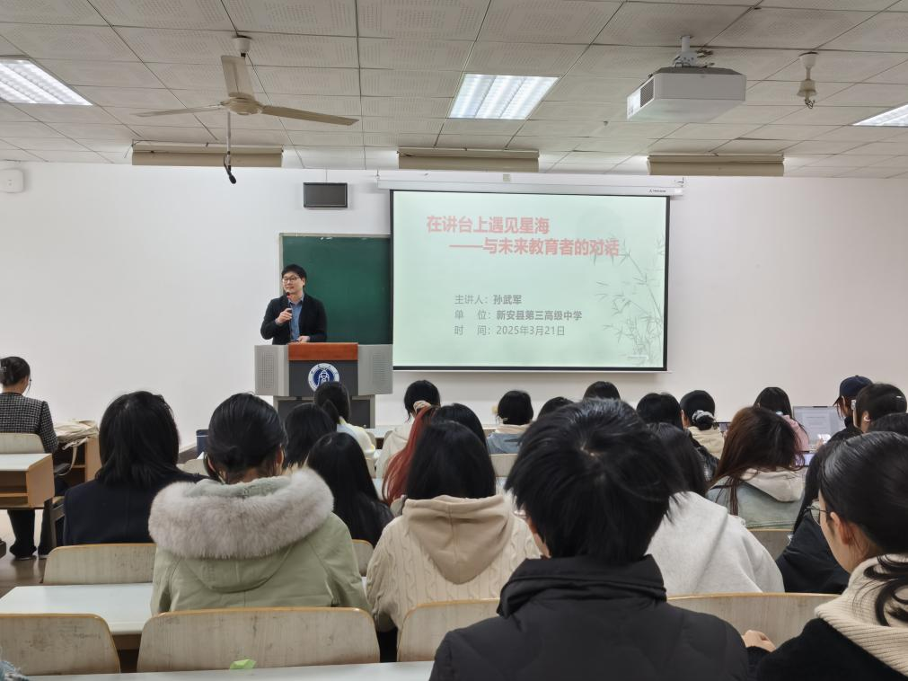 为培育师范生教育情怀,提升师范生综合素养和实践能力,3月20日下午,由学校党委学工部、学生工作处、教师教育学院主办,我院承办的公费师范生“名师有约”讲座在10教0402教室举办。新安县第三高级中学高级教师、中原名师培育对象、河南省教育厅学术技术带头人、河南省名师、洛阳市第二届优秀名师、河南省骨干教师、洛阳市第八批学术技术带头人孙武军受邀主讲。学院2024级公费师范生参加讲座。