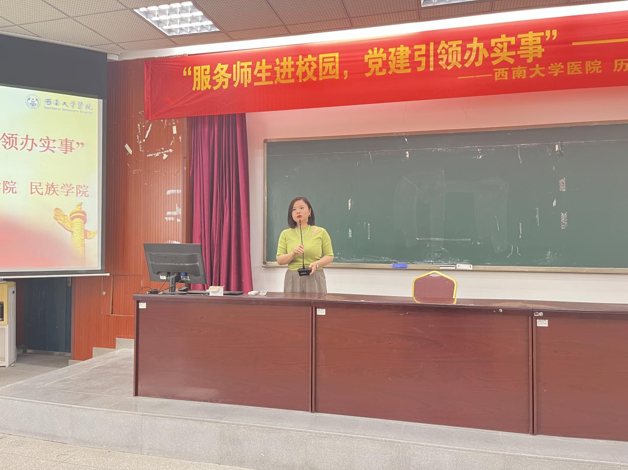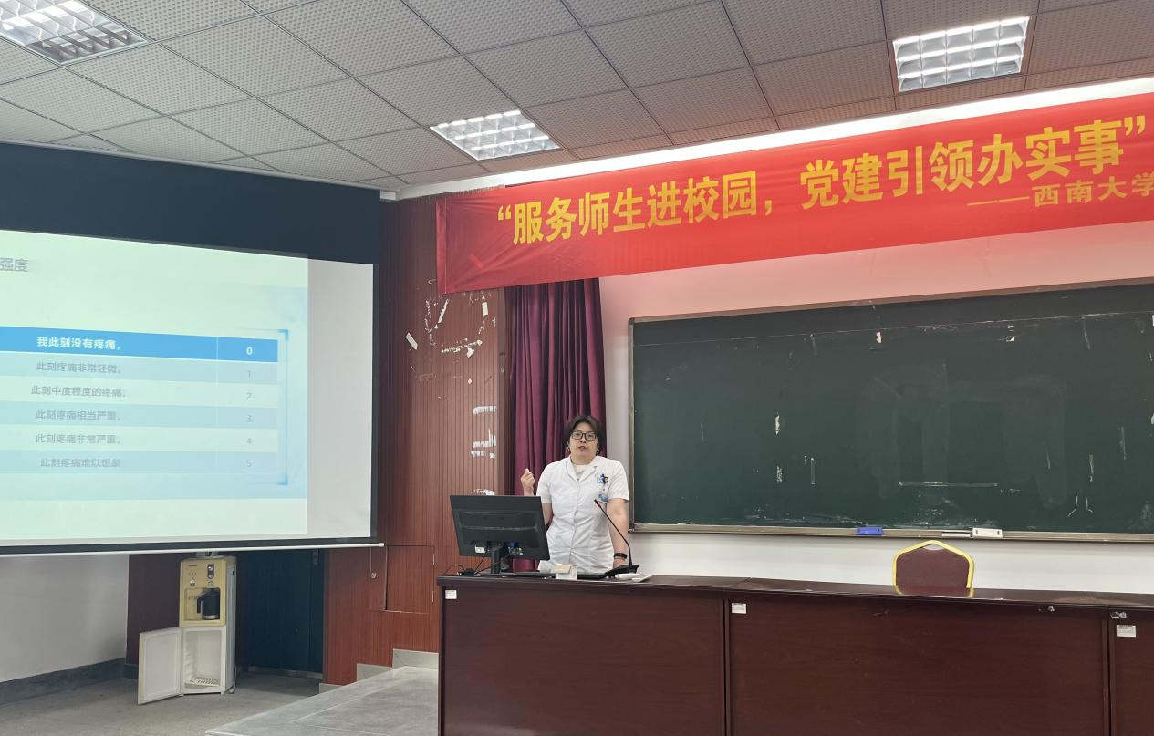 随后,医院药剂科主管药师郑先珍以《家庭安全用药须知》为题,解析常见用药误区,强调处方药规范使用的重要性;康复医学二科治疗部主任吴雪莲结合高校师生工作场景,讲授《警惕“学术颈椎”——颈椎养护秘籍》,从坐姿调整到日常保养提供系统建议;康复一科专科护士周若寒、成春梅、李乐还带领师生们学习了《舒缓颈椎操》,通过简单动作缓解肩颈疲劳,引得全场跟练互动。