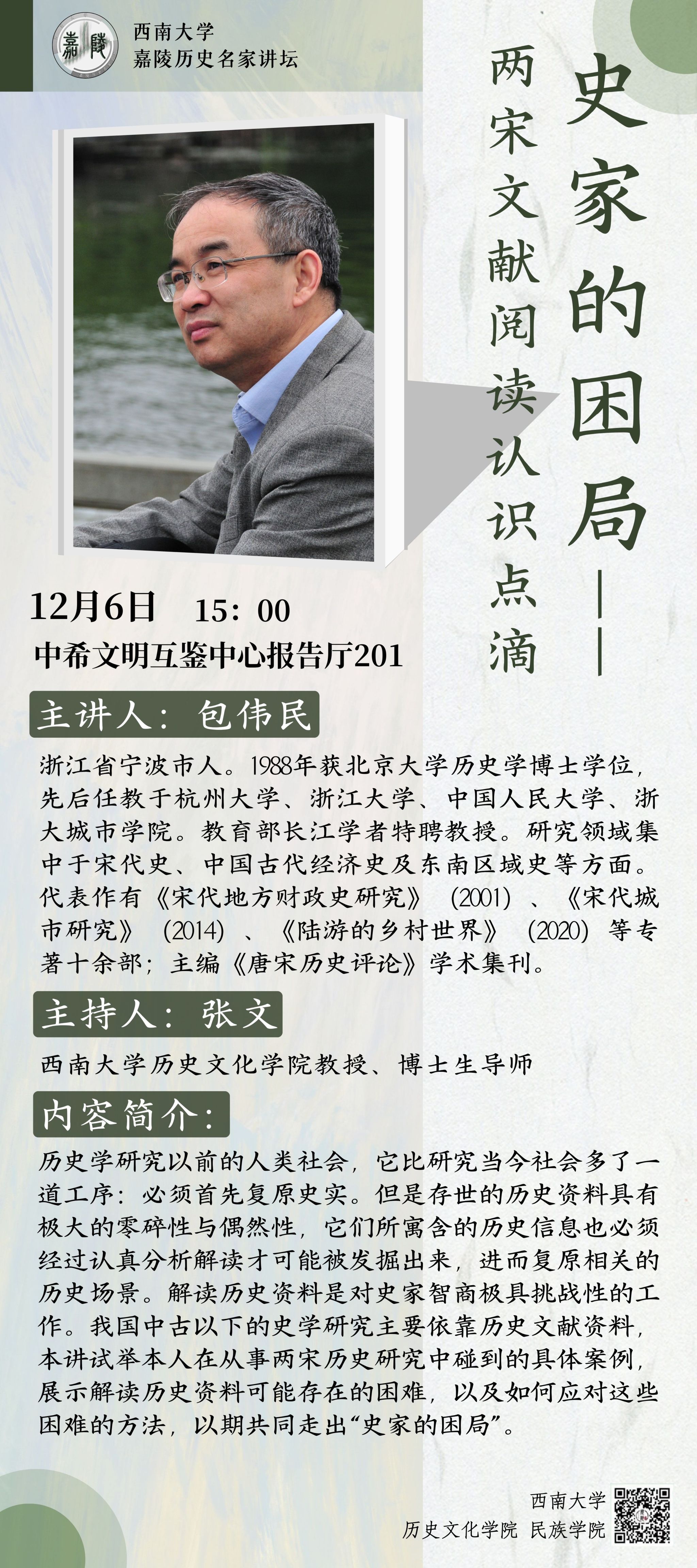 主讲人:包伟民,浙江省宁波市人。1988年获北京大学历史学博士学位先后任教于杭州大学、浙江大学、中国人民大学、浙大城市学院。教育部长江学者特聘教授。研究领域集中于宋代史、中国古代经济史及东南区域史等方面。代表作有《宋代地方财政史研究》(2001)《宋代城(2020)等专市研究》(2014)、《陆游的乡村世界》著十余部;主编《唐宋历史评论》学术集刊。