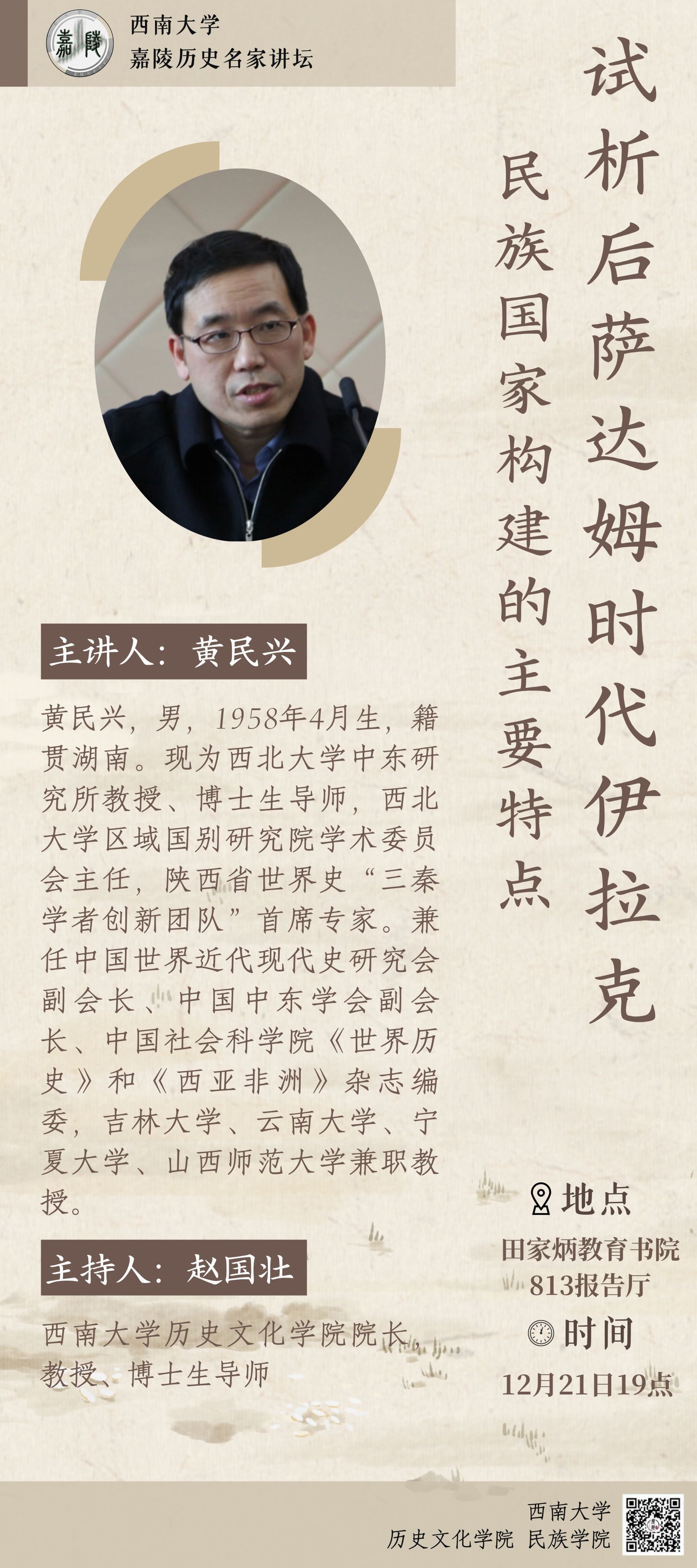 主讲人:黄民兴,男,1958年4月生,籍贯湖南。现为西北大学中东研究所教授、博士生导师,西北大学区域国别研究院学术委员会主任,陕西省世界史“三秦学者创新团队”首席专家。兼任中国世界近代现代史研究会副会长、中国中东学会副会长、中国社会科学院《世界历史》和《西亚非洲》杂志编委,吉林大学、云南大学、宁夏大学、山西师范大学兼职教授。