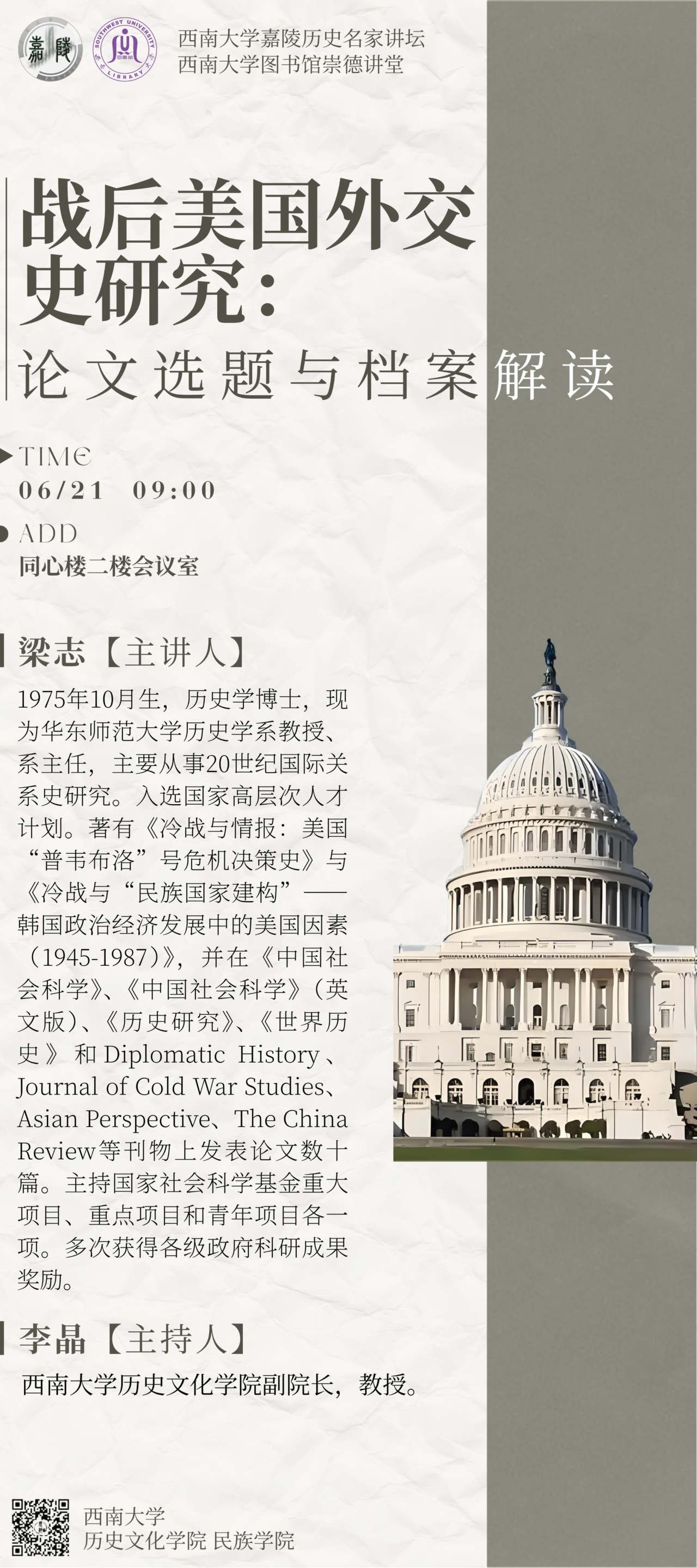 三、主讲人:梁志。1975年10月生,历史学博士,现为华东师范大学历史学系教授、系主任,主要从事20世纪国际关系史研究。入选国家高层次人才计划。著有《冷战与情报:美国“普韦布洛”号危机决策史》与《冷战与“民族国家建构”-韩国政治经济发展中的美国因素(1945-1987)》,并在《中国社会科学》、《中国社会科学》(英文版)、《历史研究》、《世界历史》和 Diplomatic History、 Journal of Cold War Studies、 Asian Perspective、The China Review等刊物上发表论文数十篇。主持国家社会科学基金重大项目、重点项目和青年项目各一项。多次获得各级政府科研成果奖励。